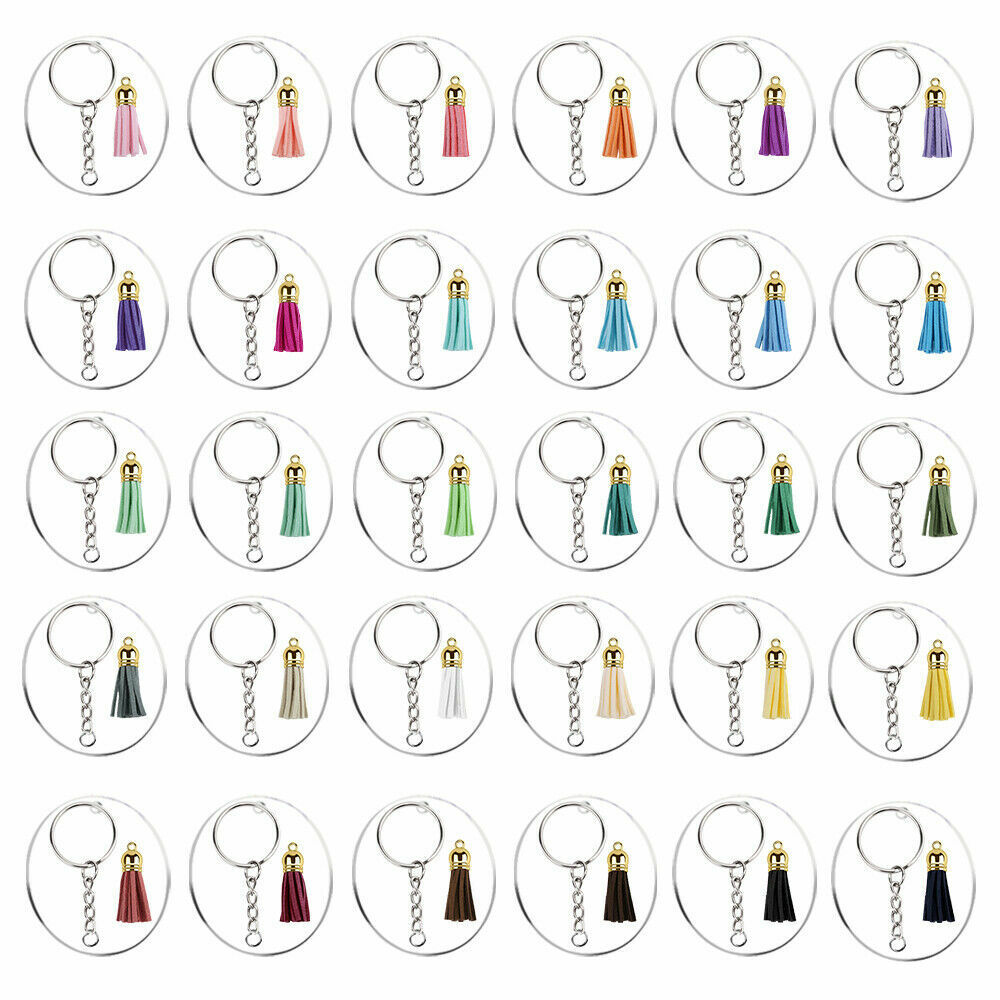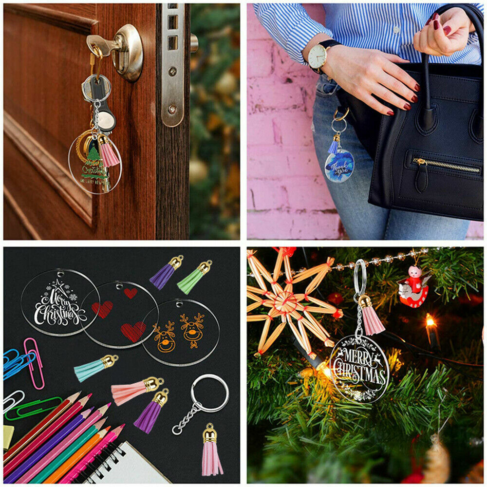 200x Keyring Clear Acrylic Circle Discs Keychain Blanks Tassel Pendants DIY Kit
