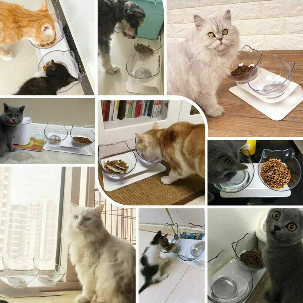 Description: Double bowl design: The large beveled side cat food and water bowl 2 in 1 reduce the...