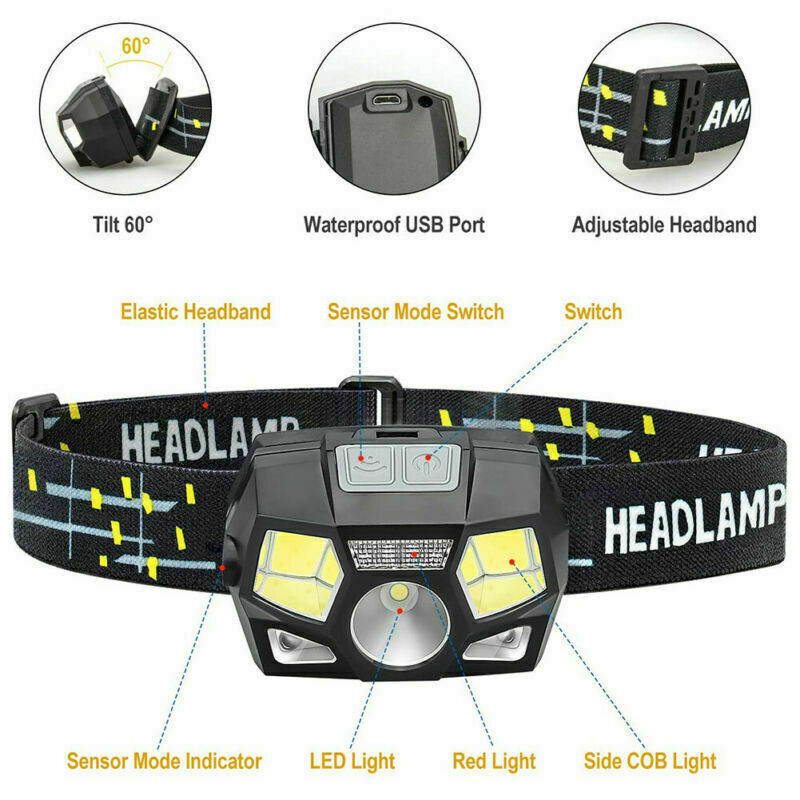 LED Head Torch Headlight COB Camping Headlamp USB Rechargeable Flashlight Lamp