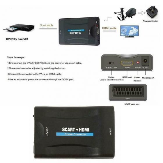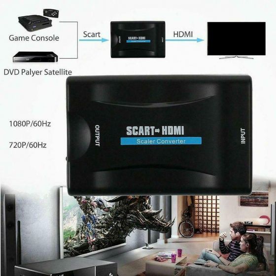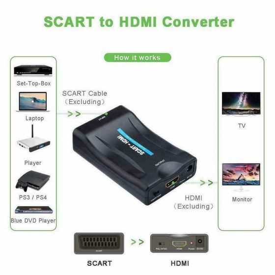 Description: 1080P SCART to HDMI Video Audio Upscale Converter Signal Adapter HD Receiver TV Plug and Play...