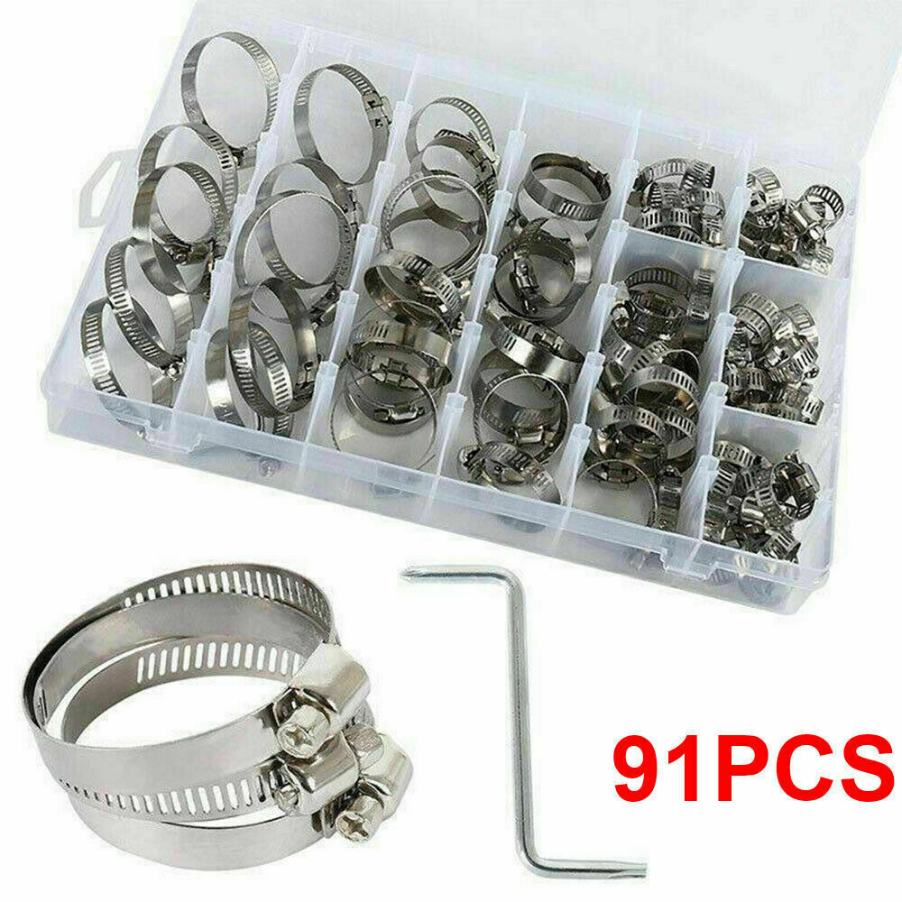 Stainless Steel Hose Clamps Clips Adjustable Range Worm Gear Pipe Clamp 91X Kit