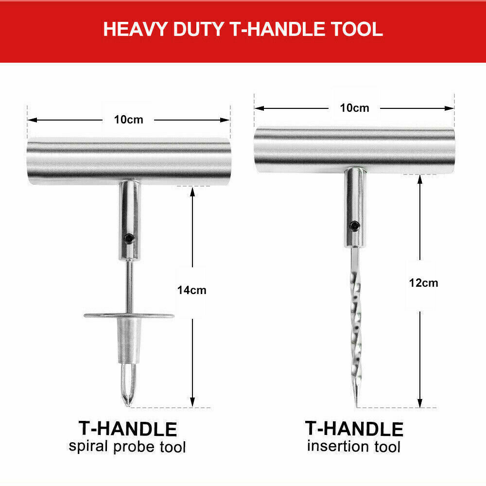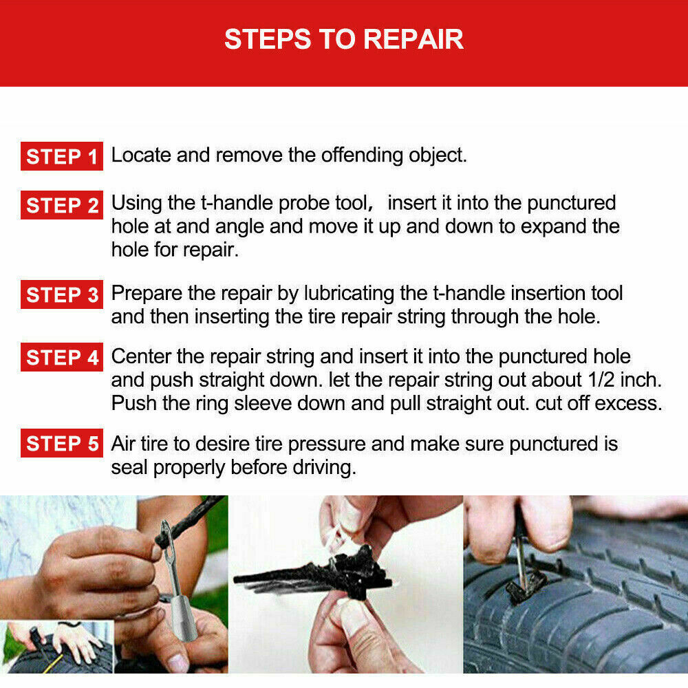 56PCSTYREREPAIR STEPS TO REPAIR: Locate and remove the offending object from tyres. Using the T-handle probe tool...